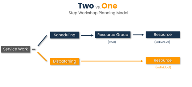 The Two-Step Planning Model is like reserving a table at a restaurant (you know you'll get a table, but not which specific one yet). Upon arrival, the host assigns you to a specific table. This approach helps with planning ahead for resource workshop groups.